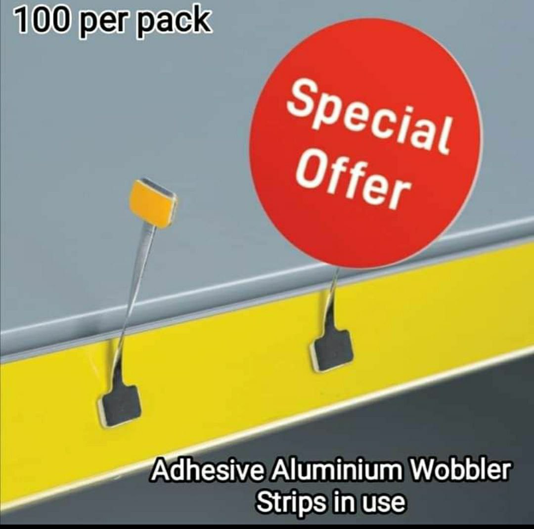 The aluminium Point of sale wobbler strips are supplied in packs of 100.