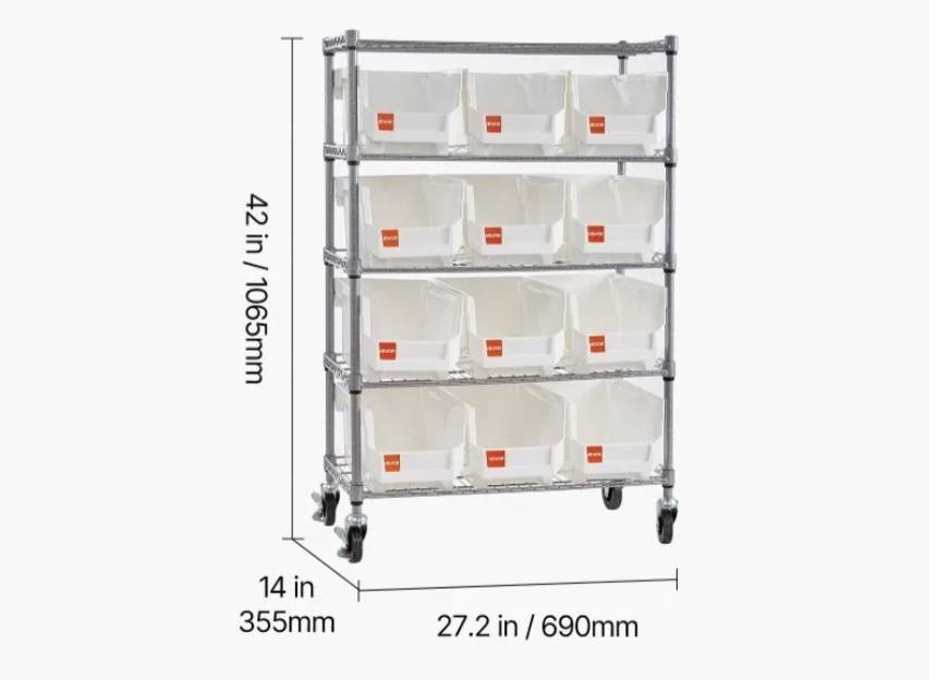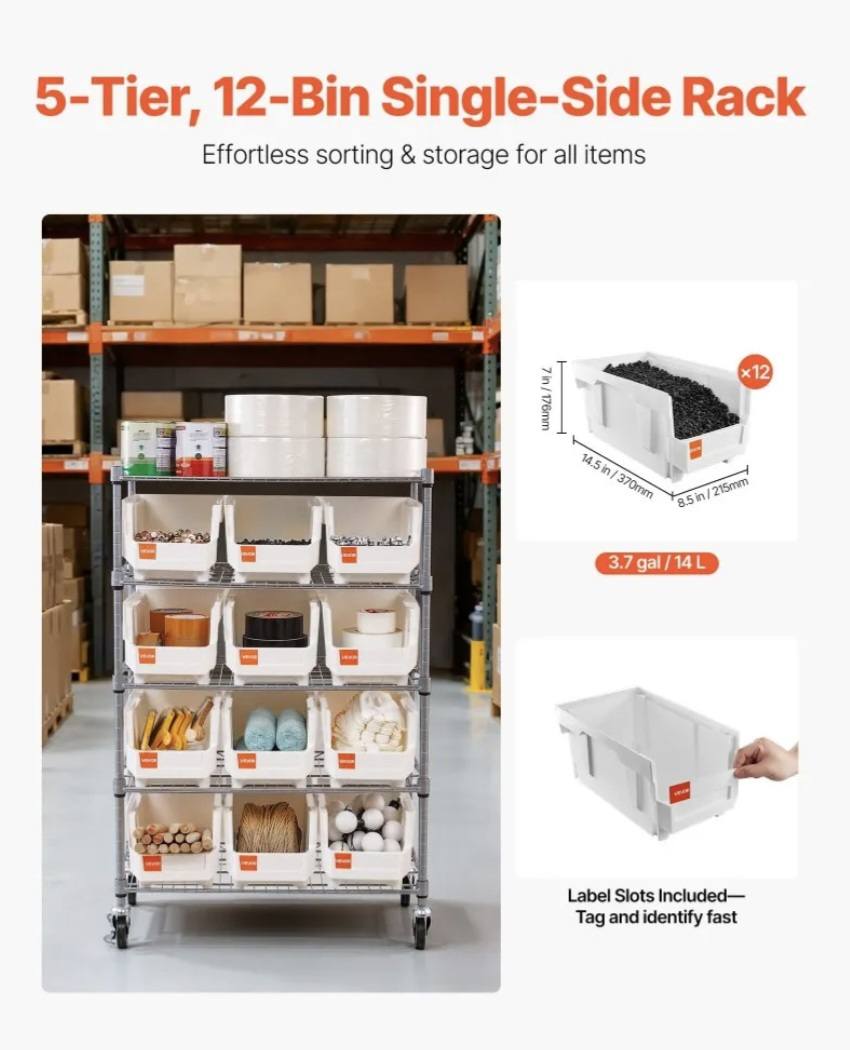 This 5-tier single-sided rolling bin rack includes 12 medium PP bins. Each bin has a label slot, so you tag, sort, and find parts fast to keep your space tidy