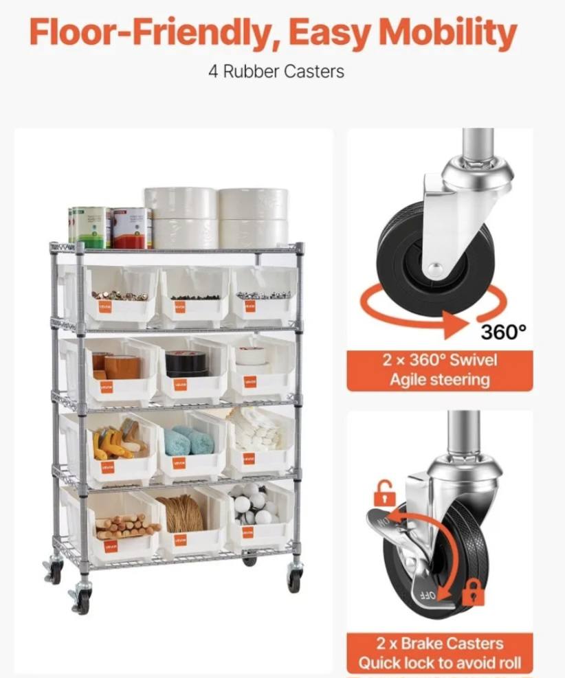 Four 360° casters glide smoothly; two lock to park. Push load up to 260 lb. Rubber wheels of the bin organizer secure floors, absorb vibration, and help hush noise while you move