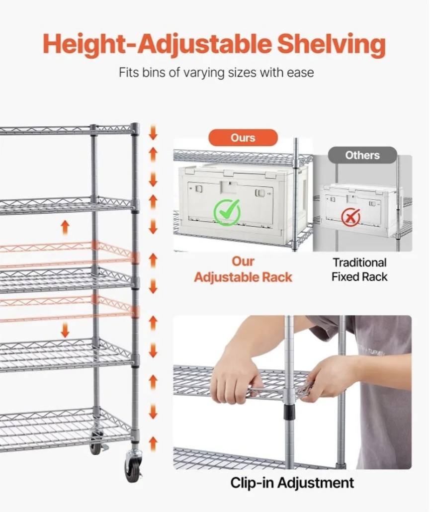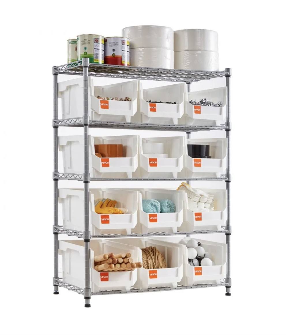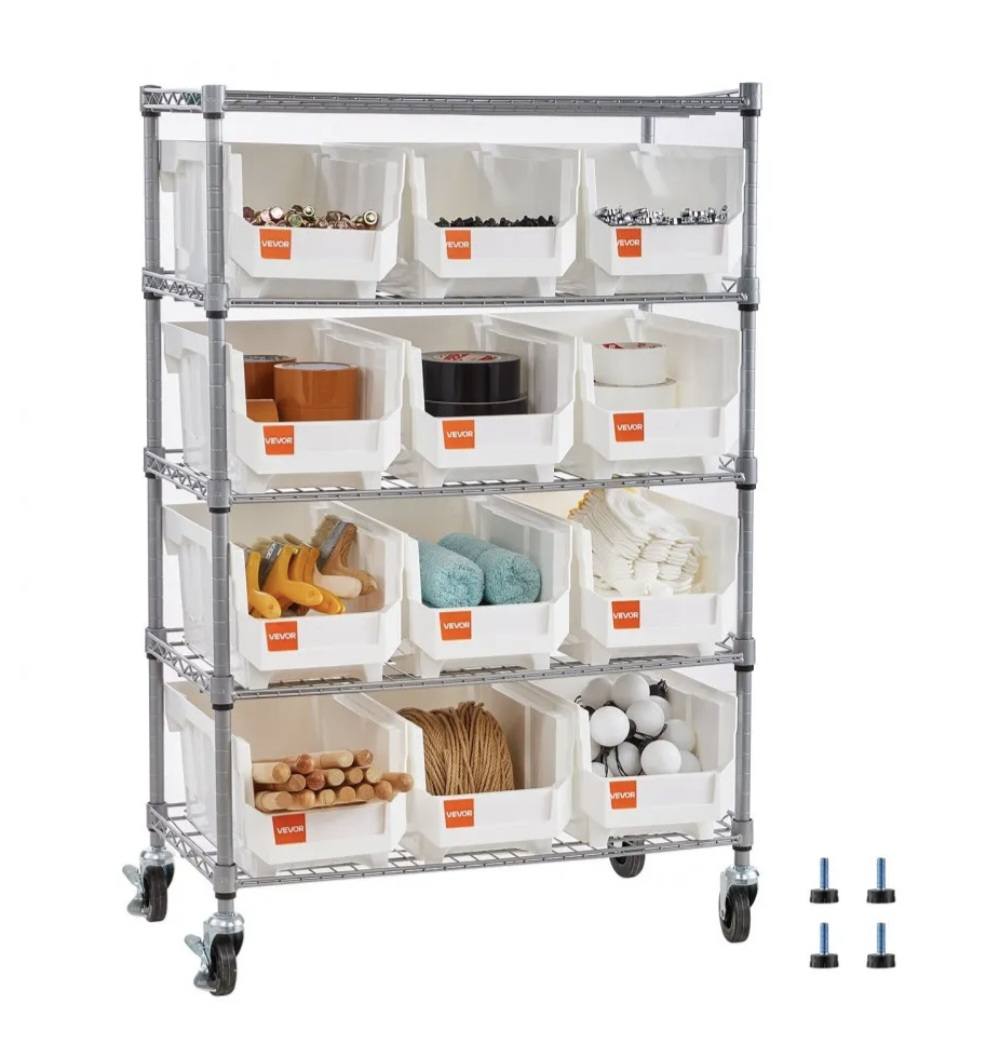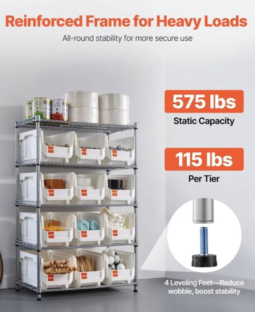 The bin storage rack supports up to 575 lb static and 115 lb per tier. Four leveling feet cut wobble and keep it steady on uneven floors, so your setup stays secure