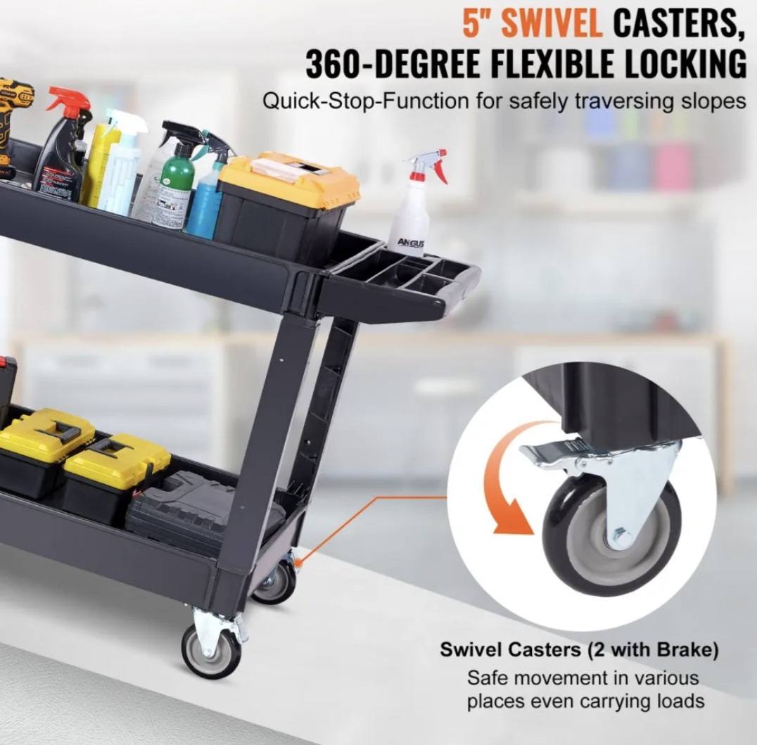 *Lockable Swivel Wheels….. Large 5-inch (12.7cm) diameter swivel casters support 360-degree flexible locking. Two of the casters feature reliable brakes and quick-stop-function, for safe and stable transportation on slopes and bends. It can effortlessly control the direction of cart even in narrow spaces. High-quality PVC wheels can absorb shock, provide silent operation without floor scratches. Perfect for Warehouses, Garages, Nursing Homes, Schools, Offices, Clinics, Hotels, or anywhere you have transportation needs.