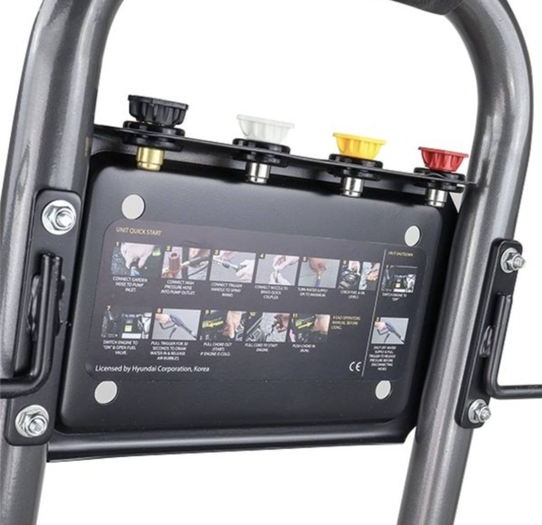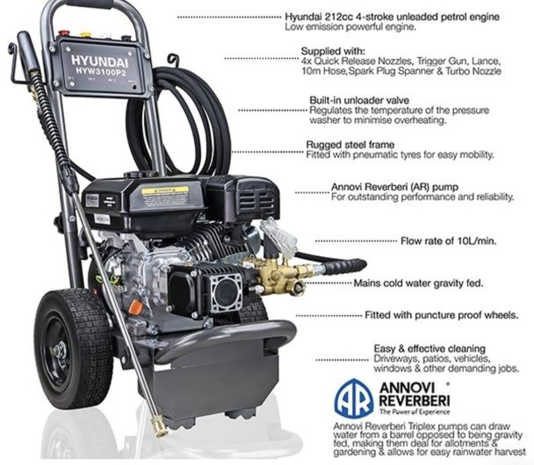 The Hyundai HYW3100P2 petrol pressure washer, powered by the Hyundai 212cc 4-stroke high torque, low-emissions recoil-start petrol engine, is engineered to handle your toughest cleaning jobs with ease.