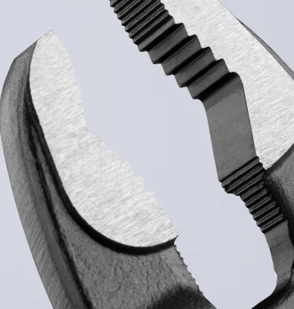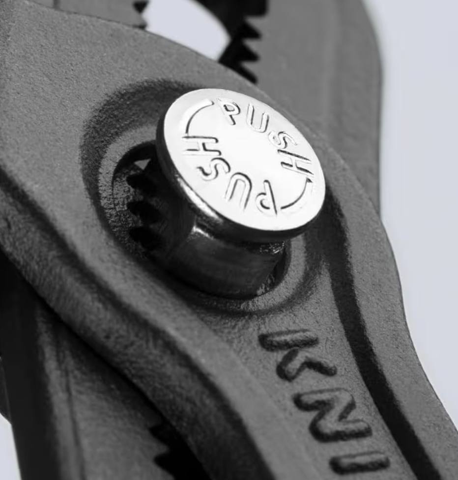 Reliable locking of the hinge bolt with the first workload. The gripping width of the pliers is then fixed and can only be adjusted by pressing the button.